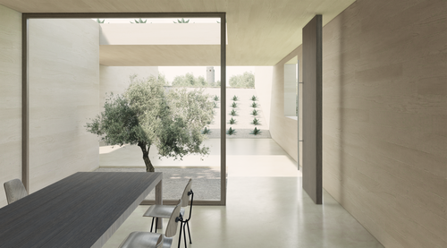 Toujours dans cette volonté de s’intégrer dans le paysage j’ai choisi d’utiliser béton banché avec des planches de bois qui marquent l’horizontalité en stratifiant la matière rappelant les traces de la terre. Le béton est teinté légèrement ocre ce qui permet de prendre la couleur du paysage.