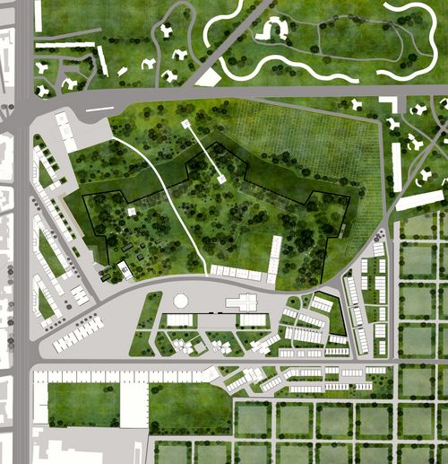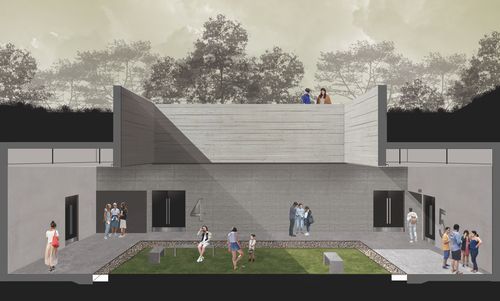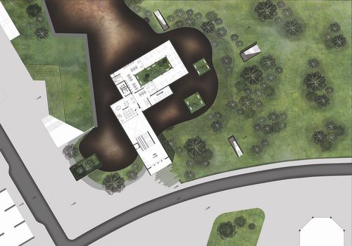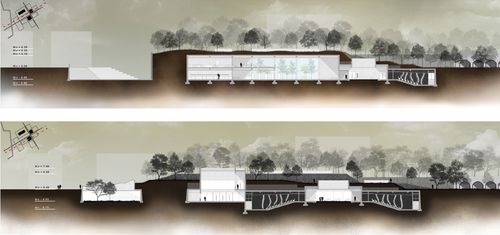 A l’intérieur, le fort offre un site exceptionnel où il semble que la nature a pris le pas sur l’artificiel. Les bruits de la ville se perdent dans la nature sauvage qui pousse dans les fosses et l’impénétrable couronne boisée. Mon parti-pris, consistant à reconstruire et élargir le paysage actuel en profitant de touts les caractéristiques existantes de l’environnement du site, vise à former un tout entre l’architecture et la nature. L’implantation du projet se propose ainsi de respecter la nature du site en enfouissant complètement le bâtiment sous le niveau du sol.