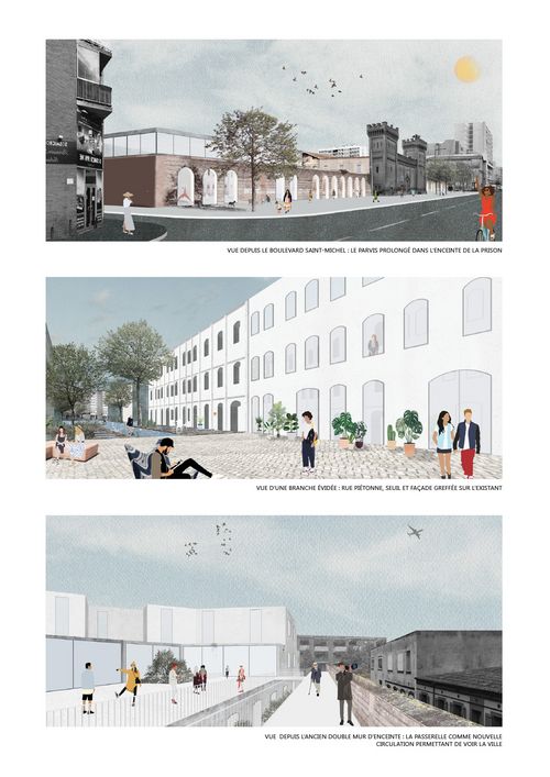 Vues du projet : mur d'enceinte percé sur le parvis de la prison, greffe de nouvelles façades sur les existantes inversées, passerelle permettant de voir la ville depuis la prison.