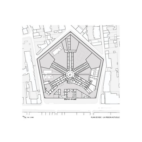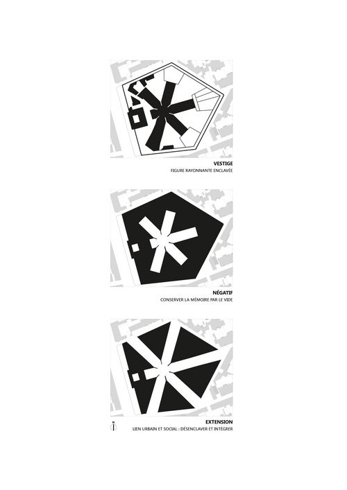 La réversibilité s’opère ainsi au niveau de la matière, qui habite les zones où les détenus n’étaient pas incarcérés, mais aussi au niveau des usages : l’étoile évidée devient espace public, lien urbain par la continuité du sol et la générosité de ses branches - à la fois réseaux et lieux d’appropriation, brisant les usages dictés de la prison. Le programme importe peu, tant qu’il crée la matière de ville inédite dans les nouveaux « pleins » à la typologie triangulaire : opérer la subversion de la prison, s’appuyer sur ses fondations et son identité, tout en s’intégrant dans le contexte urbain et en répondant aux besoins changeants de la ville.