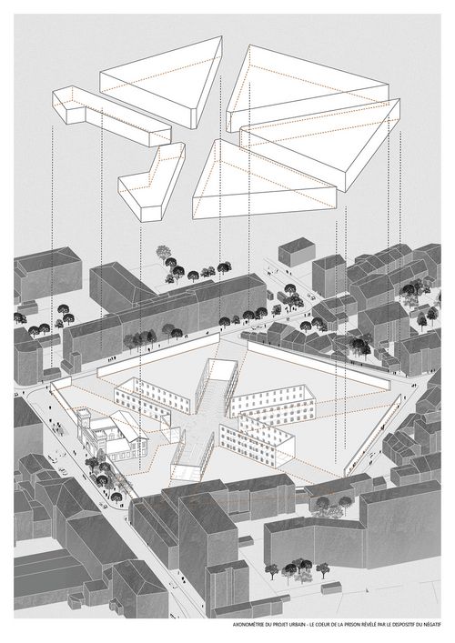 Axonométrie du projet urbain - Le coeur de la prison révélé par le négatif