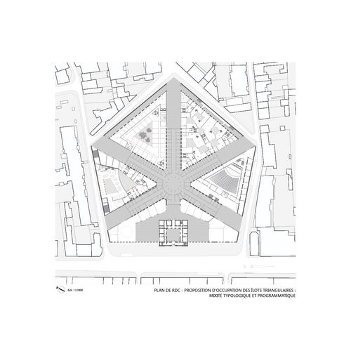 Plan de RDC du projet - Proposition d'occupation des îlots triangulaires : mixité typologique et programmatique