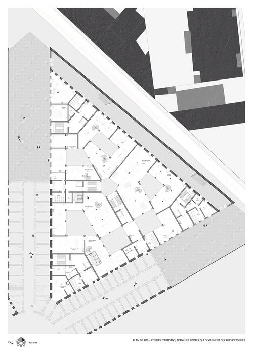 Plan de RDC d'un îlot détaillé - Branches évidées qui deviennent des rues piétonnes, traces et nouvelles matérialités, ateliers d'artisans