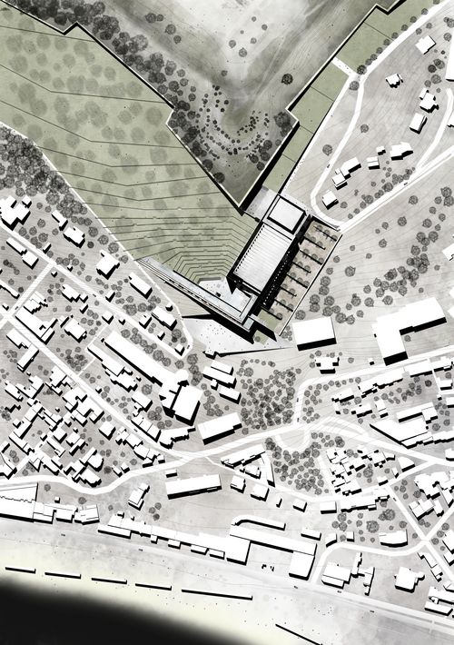 L’objectif était pour le projet de fin d’année de mettre en application tous les questionnements soulevés par l’écriture du mémoire et d’ainsi comprendre comment théorique et pratique trouvent leur articulation à travers le processus de conception du projet. Ainsi, le développement d’un projet semi-enterré m’a permis de m’intéresser au thème du sol et ses différentes composantes, primordial dans le projet architectural et ayant attrait à la matérialité des espaces. Avec l’enfouissement d’une partie du bâtiment, la question de l’apport de lumière naturelle a pris une importance toute particulière qui s’est traduite dans le projet par l’apparition de failles zénithales appartenant au vocabulaire du monde souterrain, dans un soucis d’unité de discours sur tous les aspects du projet. C’est ainsi que j’ai choisi de développer la partie des thermes dans la zone la plus profonde de l’implantation, en lien direct avec la minéralité du sol qui devient mur et que vient révéler une lumière zénithale amplifiée par les jeux de réflexion sur l’eau thermale des souterrains havrais s’écoulant dans le projet. La partie hôtelière comportant 14 chambres, quant à elle, se développe en hauteur. Nous avons donc les thermes représentant le socle, et l’hôtel le couronnement. Le tout surplombé d’une toiture terrasse accessible, en balcon sur le panorama du Havre et de la Manche d’un côté, Sainte-Adresse et le fort de l’autre.