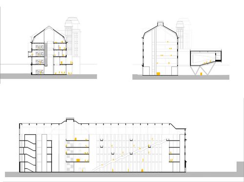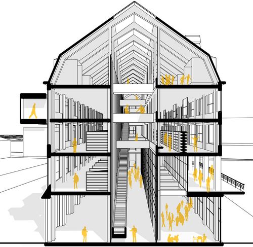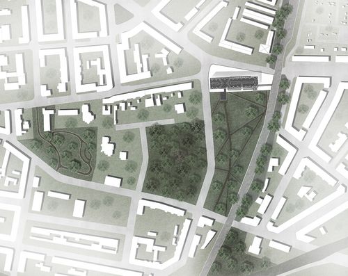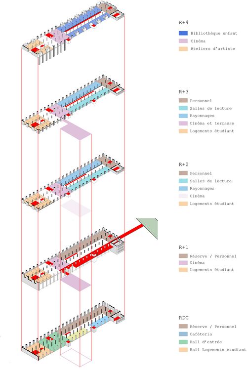 Le projet se situe à Leipzig, dans l'est de l'Allemagne. Le défi était de réhabiliter une ancienne usine de reliure en centre culturel, comportant une bibliothèque, un cinéma et des logements étudiants. Je m'appuie sur un projet de promenade urbaine de la ville pour réinsérer le bâtiment existant dans le tissu urbain. Je crée également une place au nord et un parc au sud pour remettre en valeur ce bâtiment, jusqu'ici caché par une zone importante de friche forestière. Les trois gestes architecturaux majeurs sont donc, en plus de relier le bâtiment à la promenade par une passerelle qui rentre et s'élargit en terrasse dans le bâtiment, une tranchée intérieure (un atrium donc) dans la longueur du bâtiment pour ramener de la lumière et pour y installer la circulation principale de la bibliothèque , et l'ajout d'une extension (une salle de cinéma d'une centaine de places environ), qui vient s'accrocher au bâtiment existant sur le corps principal, suivant sa tripartition. Les tours existantes sont des circulations verticales que vient réutiliser le projet : les deux tours sont les ascenseurs du cinéma et de la bibliothèque, et la tour principale comporte un escalier public qui amène à un belvédère de la ville, relié également à la passerelle. L'écriture de l'extension et de la passerelle se veulent en accord avec le passé industriel de l'ancienne usine, j'ai donc choisi un vocabulaire constructif utilisant l'acier comme matériau structurel.