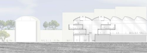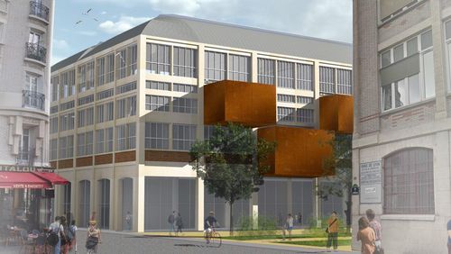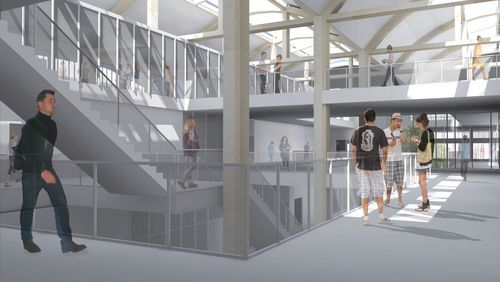 Le projet architectural prend place à l’intérieur des deux plus grandes halles des messageries. En y implantant une école d’arts graphiques, c’est l’histoire du lieu qui est revisitée. Le volume de ces halles a été l’une des clés d’entrée du projet. Afin de le rendre perceptible et significatif, les espaces s’organisent en périphérie, autour de la travée centrale. L’espace central, vide, devient alors le lieu de circulation horizontal et vertical du bâtiment. En réalisant des retraits dans les étages, la lumière peut alors pénétrer jusqu’aux pieds du bâtiment.
