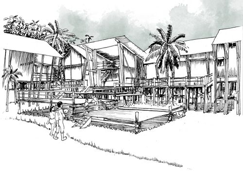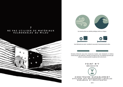 Les coraux sont des organismes extrêmement fragiles. Pour les habitants des atolls, composés uniquement de récifs coralliens, la disparition de ceux-ci est synonyme de disparition de leur habitat. Dans des conditions optimales, en revanche, le corail a la capacité de pousser à mesure que l’eau monte. La nouvelle génération se forme au-dessus l’ancienne. Ce projet développe une démarche résiliante qui s’appuie sur les ressources locales pour offrir aux habitants des îles Kiribati, un pays constitué uniquement d’atolls coralliens au milieu du pacifique, une alternative à la fuite précipitée tout en favorisant les mécanismes de croissance des coraux. La population jouant un rôle central dans ce projet, un guide lui est destiné : il explique pour il faut partir, où et comment s’implanter, et montre des techniques constructives. La partie architecturale du projet cherche à prouver que les contraintes du guide n’empêchent pas de développer une réponse architecturale de qualité, ainsi qu’à illustrer le quotidien d’un habitant du projet. Elle clôt la proposition et apporte en même temps un épilogue au guide.