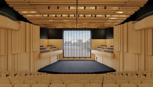 La salle de concert est elle érigée comme un objet détaché du reste du bâtiment profitant de vues sur la Seine pour en faire une toile de fond à l'espace de représentation qu'il génère.