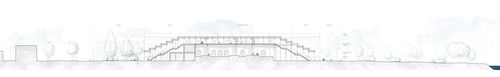 La passerelle reliant les deux hall est organisée en 3 faisceaux : un axe rapide, un lent, et une bande plantée au coeur qui organise les flux.