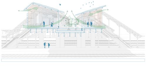 Ce coeur vert qui structure le projet est perceptible en tout point de la gare et est également le support d'une réflexion bioclimatique. Nous avons eu d'une part la volonté d'avoir une traversée de la biodiversité, pas seulement visuelle mais également écosystémique. La végétation y est intensive pour être un lieu de nutrition et de vie pour insectes et oiseaux