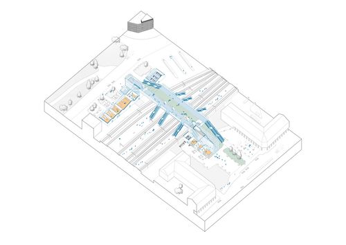 L'axe rapide permet un accès direct aux voyageurs pressés. L'axe lent est destiné aux usagers moins pressés, aux pisciacais, et propose des espaces d'attente, de travail en lien avec la bande plantée. La bande plantée structure les flux au sein de la gare. Elle traverse le bâtiment et relie les deux parvis.