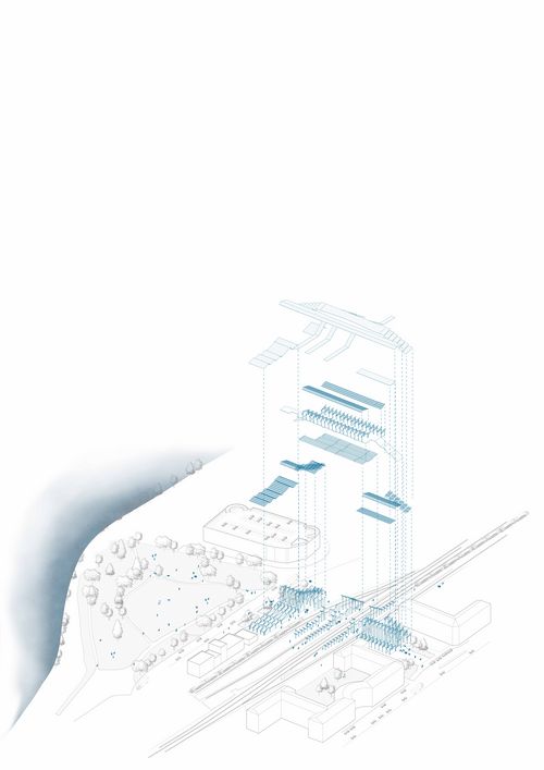 La thématique du franchissement est au coeur du projet de la nouvelle gare. Il est d'une part destiné aux piétons et la gare est considérée comme un lieu de passage public. D'autre part, il est destiné à la biodiversité. En plus de redonner un accès physique aux berges, il permet la perception de cette biodiversité depuis Poissy en la faisant traverser les rails. De cette façon, la biodiversité est au coeur du projet et elle organise la gare.