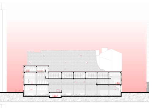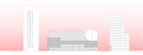 Tous les bâtiments du projet sont reliés en hauteur par un espace publique, d’où est orchestrée la mise en scène des traces