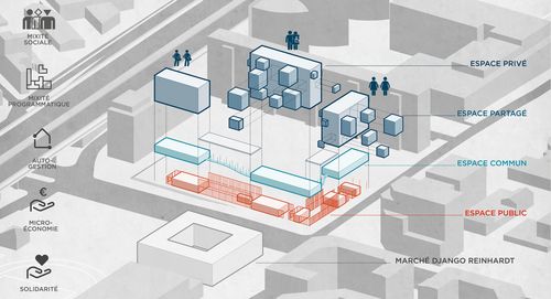 Ce projet se présente comme une alternative aux établissements existants aujourd'hui, une formalisation concrète de ce que pourrait être un espace d'accueil idéal pour les demandeurs d'asile. Il vise à ne plus être un simple espace d'hébergement mais un lieu plus complexe, où les demandeurs d'asile pourront se former, travailler, rencontrer et partager des moments privilégiés avec les habitants.