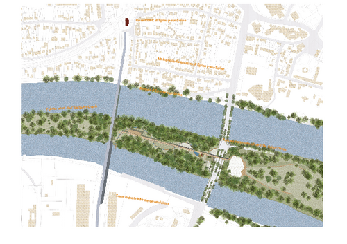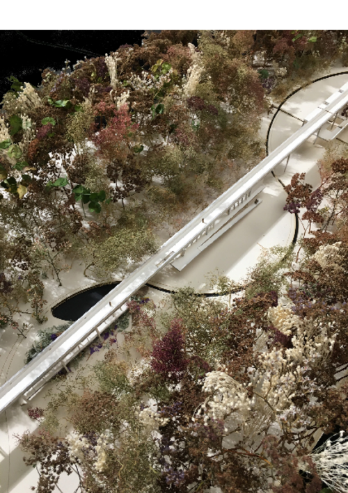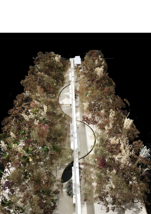 En se mettant à distance nous mettons en valeur ce sol. Le projet se construit sur pilotis, au travers de la constitution d'une passerelle habitée, soit en sous face de la passerelle, à 4 mètres du sol, soit au niveau même de cette passerelle, à 7 mètres ou en sur hauteur. Cette ligne de 380 m de long devient alors un cheminement aérien qui permet de découvrir et franchir ce monde du vivant.