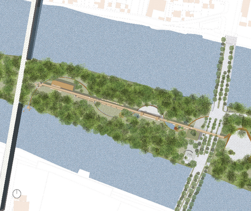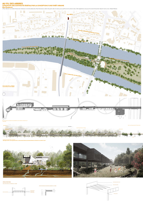 Le premier objectif à été de se servir de ce potentiel d'être entre deux zones végétales afin de concevoir une continuité entre le parc départemental et la pointe nord de L'Ile-Saint-Denis. Ainsi, imaginer un nouvel espace, ainsi redensifier la végétation. Pour cela, il a fallu travailler cet espace de manière à immerger dès l'entrée les visiteurs dans une forêt urbaine, les invitant à se sensibiliser avec elle, à lui porter attention et à en rechercher les qualités. J'ai souhaité m'intéresser à la dimension du monde vivant dans la conception, d'accorder une importance et d'ajuster le projet à l'intérêt de ce vivant observées dans ce milieu.