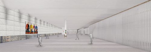 Ce projet s'inscrit dans le cadre d'une recherche et reprend des thèmes abordés dans le mémoire réalisé au semestre précédent, L'ordre du merveilleux, le ciel de la pièce chez Louis Kahn. L'espace de la structure, était donc un instrument majeur dans ce PFE , ainsi que la question du ciel lumineux pour la salle d'exposition comprise dans les poutres longitudinales.