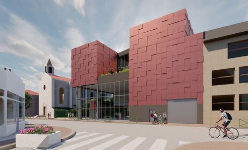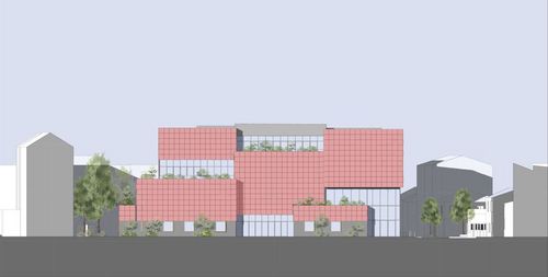 Ce qui crée la Géométrie de l'édifice est un assemblage des " boites " qui se succèdent et s'articulent entre elles en décalage et par leurs différentes dimensions. Ces décalages forment la silhouette de l'édifice. Ce qui crée une diversité des vis-à-vis, une diversité des formes de façades et une diversité des hauteurs, cela permet notamment l'implantation par rapport au pignon du centre de santé mais aussi l'adaptation par rapport à l'église qui, par son clocher, reste plus grande et n'est pas surplombée par l'édifice.