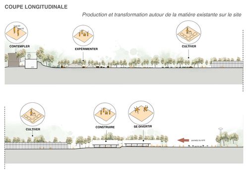 L'objectif est de transformer la matière sur l'Ile-Saint-Denis à travers l'agriculture, la terre ainsi que le réemploi. Grâce à son programme mixte, cette parcelle permet d'articuler la production, l'initiation et la découverte à travers de nombreuses activités (cultiver, expérimenter, contempler, se divertir, construire etc.) Le but est de produire et de transformer le site par le biais des matériaux existants non seulement sur le site (terre, bloc de pierre, planche de bois...) mais aussi sur l'Ile-Saint-Denis (chantier des JO, port de Genevilliers...).