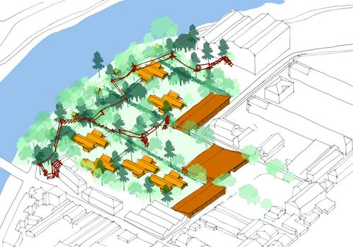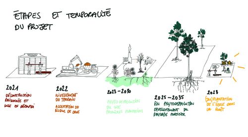 Le site choisi pour réaliser ce programme est une friche industrielle à Charleville-Mézières. Après déconstruction et phytodépollution, le paysage créé est alors prêt à recevoir les petites graines de l'école composée de 3 grands bâtiments commun en alignement sur la ville, de pavillon de classes disséminés entre les bosquets et de petits observatoires/dortoirs noyés dans la végétation.