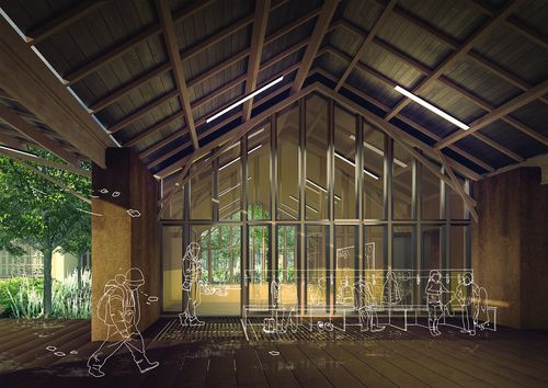Coupe longitudinale perspective sur une classe et son extérieur.