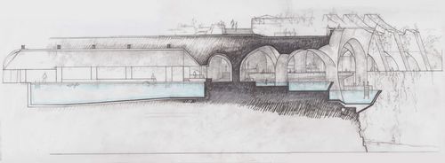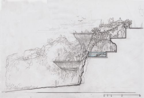En surface se dessine, sur le chemin des douaniers requalifié, une forme d'agora en terrasse incorporant une nouvelle salle de musée en surplomb et un amphithéâtre de verdure adossé à la pente. Ces constructions, faites de pierres extraites de la falaise, recherchent le naturel, l’intemporel, un ailleurs ludique propre à la rêverie.