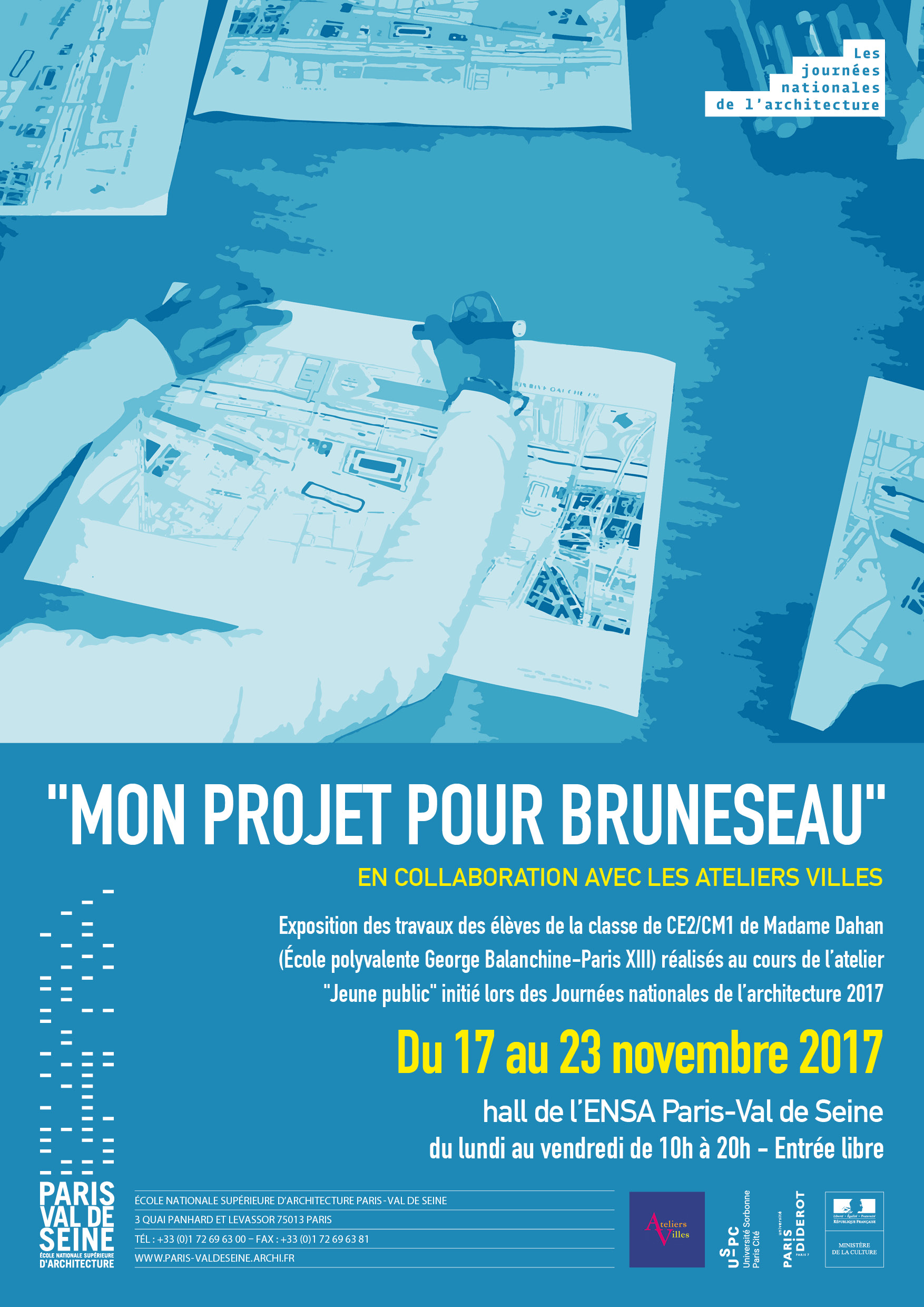 Les élèves de la classe de CE2/CM1 de l’école polyvalente George Balanchine (Paris XIII) ont eu à imaginer et à présenter sous la forme d’une maquette un projet de bâtiment qui prendrait place sur le secteur Bruneseau. L’exposition « Mon projet pour Bruneseau » restitue leurs travaux dans le hall de l’École.