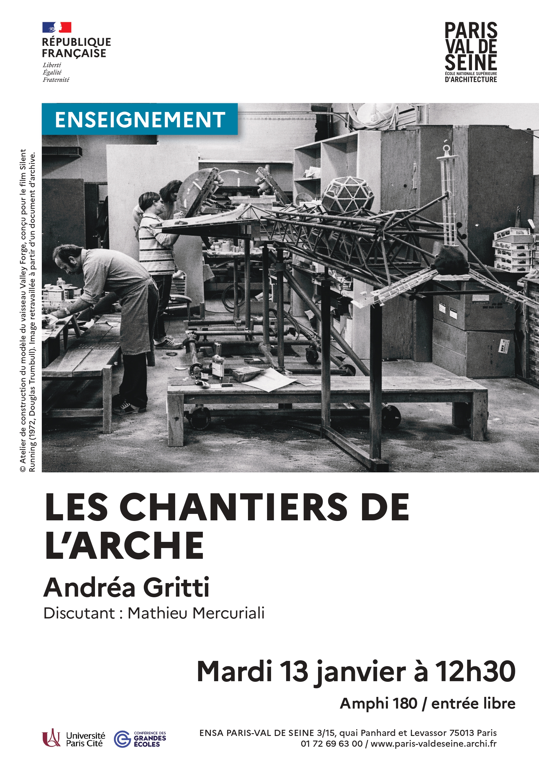 Andréa Gritti est enseignant invité de l'ENSA Paris-Val de Seine, pour l'occasion, il donne une conférence intitulée “Les chantiers de l'Arche”, le mardi 13 janvier à 12h30 en Amphi 180.