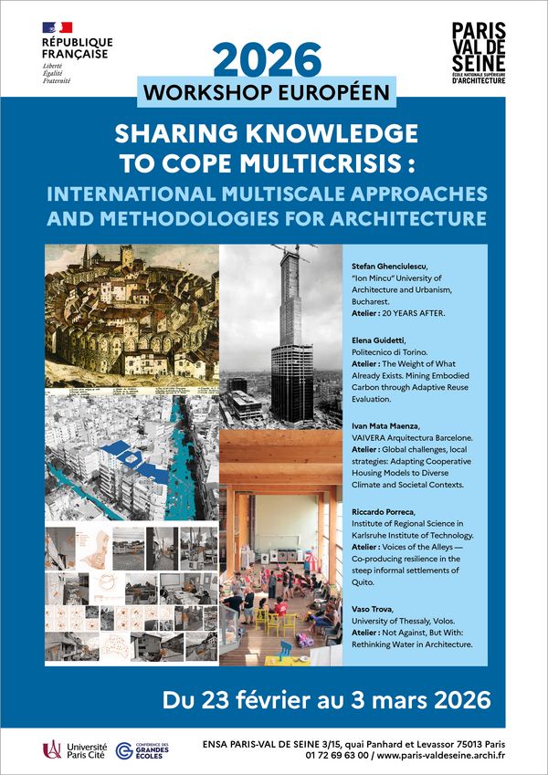 Le workshop européen 2026 “Sharing knowledge to cope multicrisis : international multiscale approaches and méthodologies for architecture”* se propose comme un espace de confrontation intellectuelle et d’expérimentation collective. Réunissant étudiants, enseignants, chercheurs et praticiens issus de divers contextes culturels, il vise à mettre en dialogue approches théoriques et pratiques, à croiser disciplines et expériences, afin de produire une réflexion partagée sur les enjeux contemporains de l’architecture.