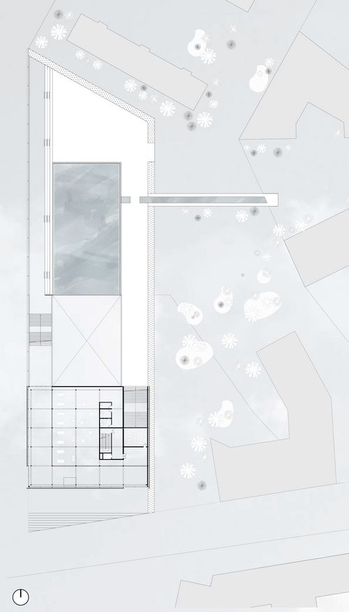 Le deuxième projet entre la roche et l’eau se développe autour du thème de la culture. L’édifice offre différents points de vue sur la ville et l’horizon tout en s’intégrant dans la topographie du site. Les bâtiments deviennent partie intégrante d'une promenade urbaine et offre ainsi un nouveau rapport à l'espace public.