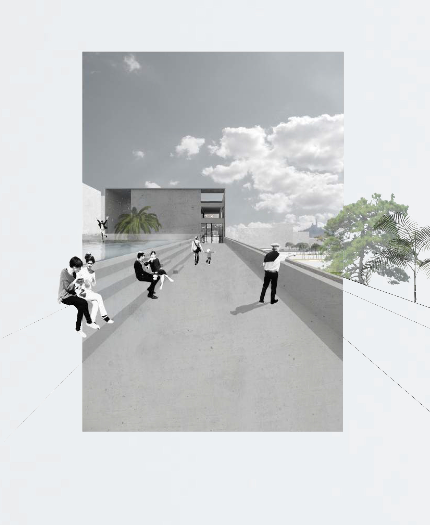 Le deuxième projet entre la roche et l’eau se développe autour du thème de la culture. L’édifice offre différents points de vue sur la ville et l’horizon tout en s’intégrant dans la topographie du site. Les bâtiments deviennent partie intégrante d'une promenade urbaine et offre ainsi un nouveau rapport à l'espace public.
