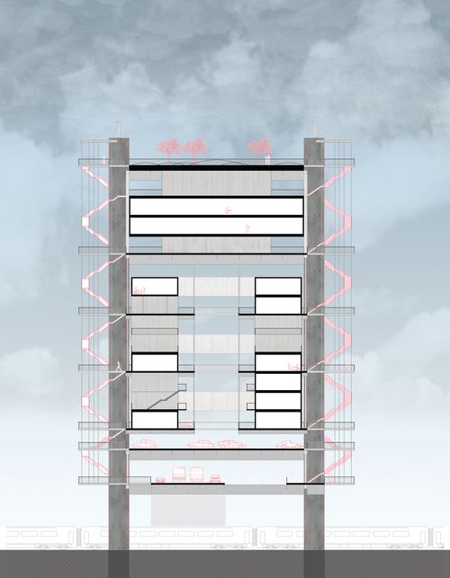 Le programme se superpose sur 7 niveaux pour une hauteur totale de 75m. Il est composé d’environs 500 habitations, 3000m² de bureaux, 5 équipements, de divers commerces, restaurants et bars, de 15 000m² de parking, d’un jardin belvédère et d’un marché.