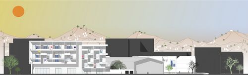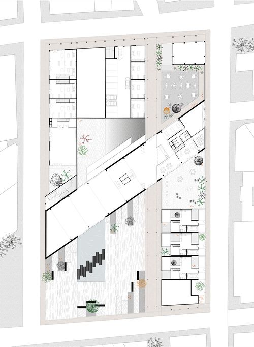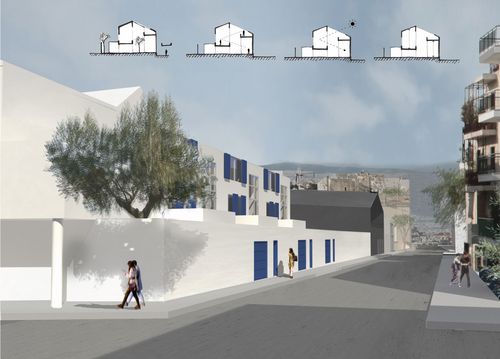 A Athènes, Metaxourgeio est un quartier au pied de l’Acropole et cependant en dehors du centre-ville. Ancienne zone industrielle et en grande partie laissée à l’abandon à la fin du XXe siècle, elle devient aujourd’hui un quartier alternatif en mutation. Envahi par les cafés, théâtres et galeries d’art, ce quartier compte encore un grand nombre de parcelles vides ou abandonnées au sein d’îlots déconstruits. Ce projet s’inscrit dans l’idée de restructurer l’îlot urbain en prenant en compte l’existant, réunifiant les résidus parcellaires et en apportant une unité et une cohérence à l’ensemble bâti.