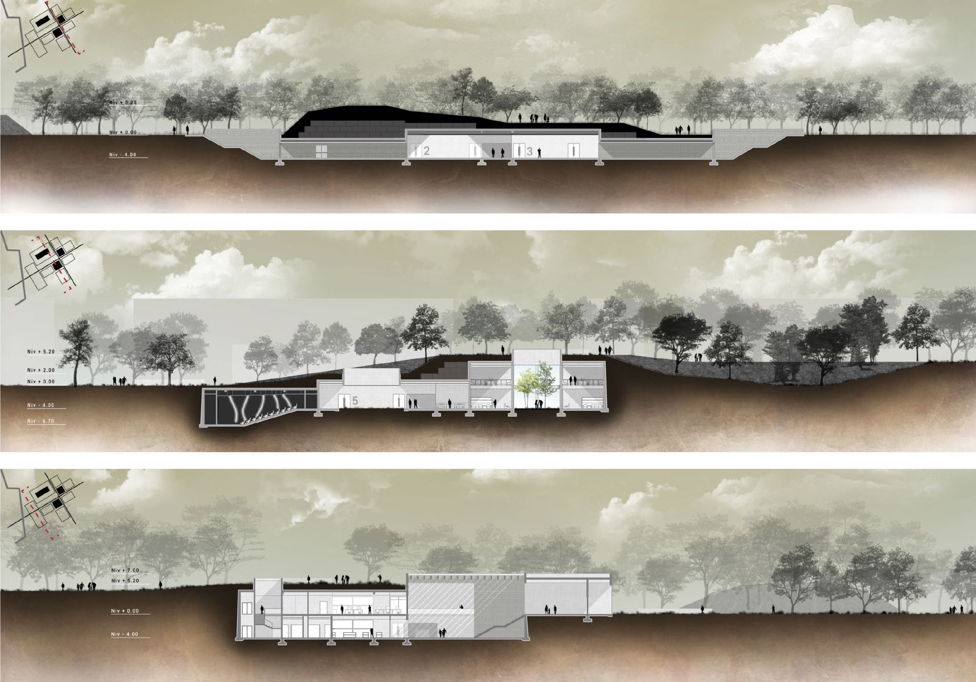 A l’intérieur, le fort offre un site exceptionnel où il semble que la nature a pris le pas sur l’artificiel. Les bruits de la ville se perdent dans la nature sauvage qui pousse dans les fosses et l’impénétrable couronne boisée. Mon parti-pris, consistant à reconstruire et élargir le paysage actuel en profitant de touts les caractéristiques existantes de l’environnement du site, vise à former un tout entre l’architecture et la nature. L’implantation du projet se propose ainsi de respecter la nature du site en enfouissant complètement le bâtiment sous le niveau du sol.