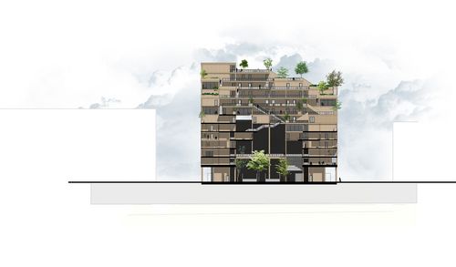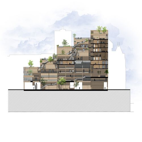 Le bâtiment conçu se développe à travers une série de terrasses végétalisées, disposées en cascade et reliées entre elles par différents jeux de circulation. Ainsi se dresserait une colline habitée au-dessus du marché aux fleurs.