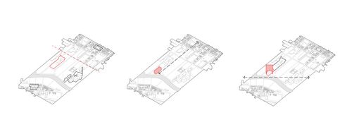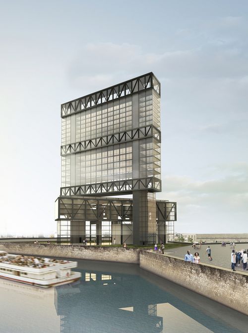 Le projet doit constituer un signal, pour le quartier mais aussi pour la ville (retour à la question d’une nouvelle centralité). Ainsi pour répondre à ce devoir, le projet adopte deux orientations qui se lisent dans sa forme : la première orientation concerne le bâtiment public et le conservatoire, elle vient dans l’alignement des façades du bâti pré existant (le Mana puis les maisons après) pour se jeter vers la rivière. Au dessus, pour répondre aux tours du Loop, un bâtiment (bureaux et hotels principalement, salles de sport, spa, ainsi qu’un restaurant dans les deux derniers étages de la tour) vient pivoter par rapport à l’axe signifié par l’équipement et s’aligne alors sur la rivière. Ce pivot vient caractériser le bâtiment, il devient un élément remarquable, à la matérialité lègère (acier et matériaux bruts visibles, pour répondre à ce paysage industriel). Enfin, la parcelle est pensée comme une place entourant le bâtiment et une extension de celui-ci, les activités de spectacle pouvant s’y poursuivre.