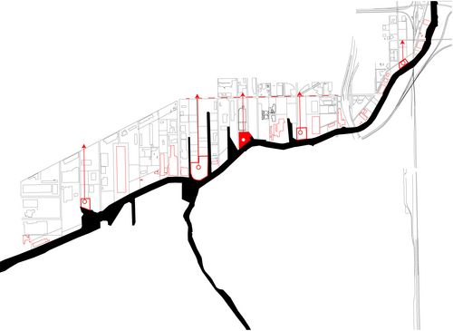 Le bâtiment vient dessiner les contours d’un nouveau front, le front de rivière. Cette dernière s’ouvre enfin : aux habitants des quartiers d’habitation alentours, mais aussi à la ville et ses citoyens et usagers. Elle devient un élément de plaisance, aux berges aménagées. Elle assure alors complètement sa capacité de liant entre le nord et sud. Surtout, elle retrouve sa valeur paysagère. L’enjeu de ce projet, c’est d’envisager un bâtiment qui permette de sortir de ce rapport entre avant ville et arrière ville, ce faisant, de rendre au paysage alentour tout son potentiel. Cette démarche urbaine permet de repenser le corridor, et marque la formation progressive d’un front de rivière, dessiné par une série de bâtiments, sur le modèle de ce projet (immeuble en bord de rivière, dans la continuité des rues tracées par la grille).