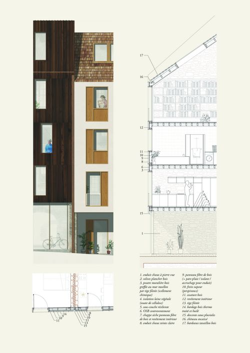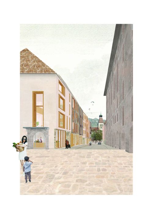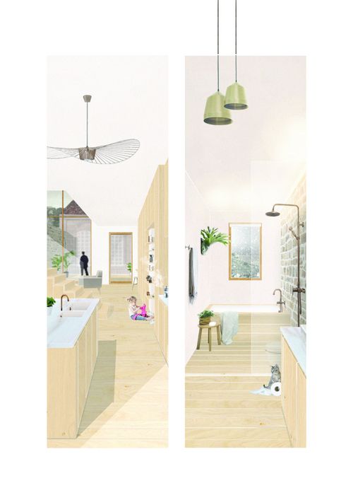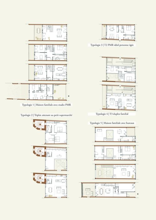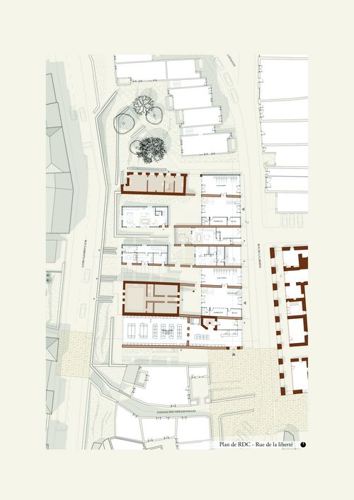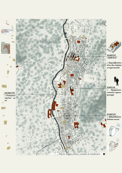 L’intervention est développée linéairement selon les problématiques relevées dans les trois quartiers identifiés. Un îlot ancien est requalifié en priorité dans la rue reliant le centre Unesco aux nouveaux thermes. Vacant et dense, touché par la mérule (champignon lignivore), il est sculpté et cureté aux parties fragilisées. De nouveaux logements aux typologies diverses enlacent ces «pépites architecturales» en cœur d’îlot intergénérationnel (du T2 PMR pour personne âgée à la maison de ville familiale).