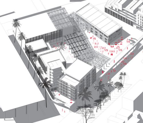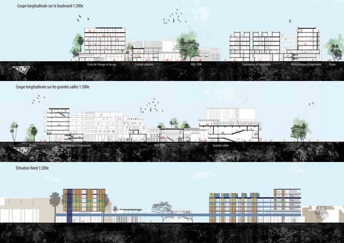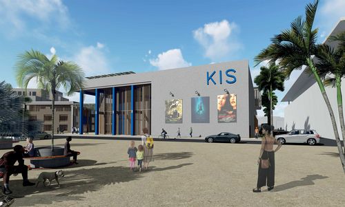 Axonométrie de l'ensemble du KIS (école de cinéma,salles de projection,cinéma en plein air, théâtre, restaurant solidaire.))