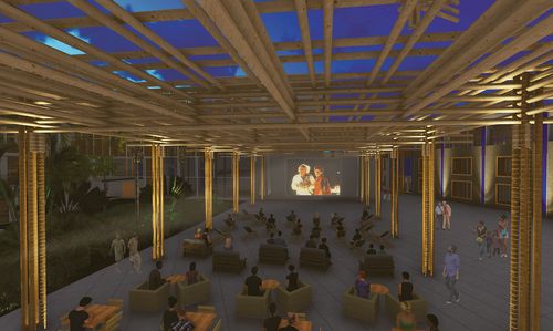 Perspective depuis l'étage du restaurant solidaire - Cinéma en plein air sous la canopée en bambou