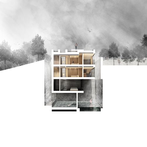 L’objectif était pour le projet de fin d’année de mettre en application tous les questionnements soulevés par l’écriture du mémoire et d’ainsi comprendre comment théorique et pratique trouvent leur articulation à travers le processus de conception du projet. Ainsi, le développement d’un projet semi-enterré m’a permis de m’intéresser au thème du sol et ses différentes composantes, primordial dans le projet architectural et ayant attrait à la matérialité des espaces. Avec l’enfouissement d’une partie du bâtiment, la question de l’apport de lumière naturelle a pris une importance toute particulière qui s’est traduite dans le projet par l’apparition de failles zénithales appartenant au vocabulaire du monde souterrain, dans un soucis d’unité de discours sur tous les aspects du projet. C’est ainsi que j’ai choisi de développer la partie des thermes dans la zone la plus profonde de l’implantation, en lien direct avec la minéralité du sol qui devient mur et que vient révéler une lumière zénithale amplifiée par les jeux de réflexion sur l’eau thermale des souterrains havrais s’écoulant dans le projet. La partie hôtelière comportant 14 chambres, quant à elle, se développe en hauteur. Nous avons donc les thermes représentant le socle, et l’hôtel le couronnement. Le tout surplombé d’une toiture terrasse accessible, en balcon sur le panorama du Havre et de la Manche d’un côté, Sainte-Adresse et le fort de l’autre.