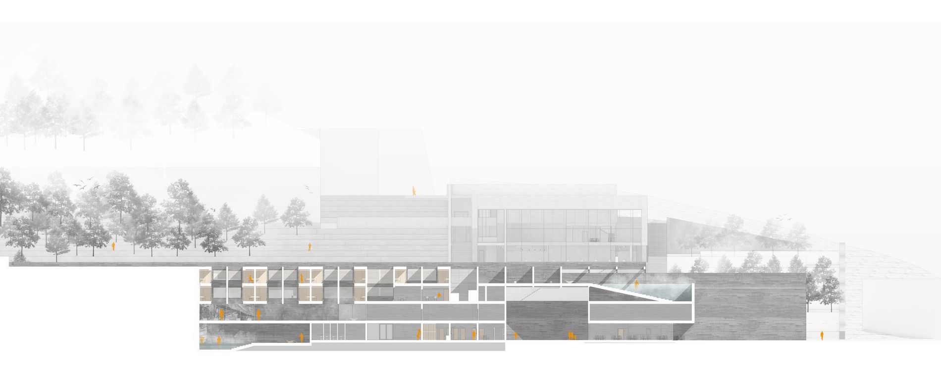 L’objectif était pour le projet de fin d’année de mettre en application tous les questionnements soulevés par l’écriture du mémoire et d’ainsi comprendre comment théorique et pratique trouvent leur articulation à travers le processus de conception du projet. Ainsi, le développement d’un projet semi-enterré m’a permis de m’intéresser au thème du sol et ses différentes composantes, primordial dans le projet architectural et ayant attrait à la matérialité des espaces. Avec l’enfouissement d’une partie du bâtiment, la question de l’apport de lumière naturelle a pris une importance toute particulière qui s’est traduite dans le projet par l’apparition de failles zénithales appartenant au vocabulaire du monde souterrain, dans un soucis d’unité de discours sur tous les aspects du projet. C’est ainsi que j’ai choisi de développer la partie des thermes dans la zone la plus profonde de l’implantation, en lien direct avec la minéralité du sol qui devient mur et que vient révéler une lumière zénithale amplifiée par les jeux de réflexion sur l’eau thermale des souterrains havrais s’écoulant dans le projet. La partie hôtelière comportant 14 chambres, quant à elle, se développe en hauteur. Nous avons donc les thermes représentant le socle, et l’hôtel le couronnement. Le tout surplombé d’une toiture terrasse accessible, en balcon sur le panorama du Havre et de la Manche d’un côté, Sainte-Adresse et le fort de l’autre.