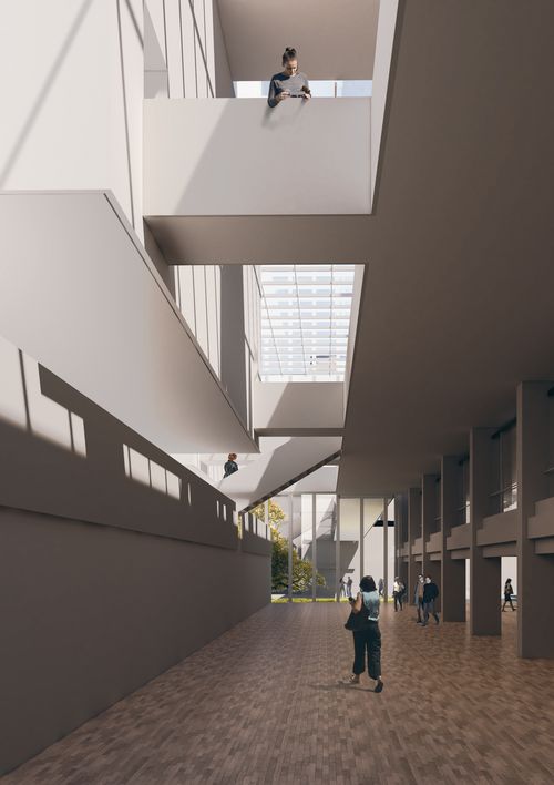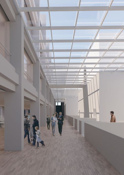 - Perspectives depuis l'accès aux bureaux avec l'accès du public surplombant le hall