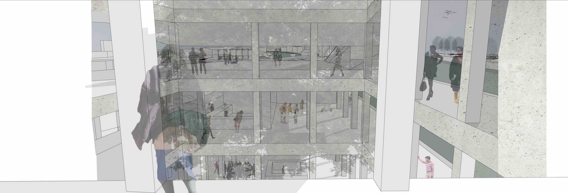 À la suite d’une étude en début de master 2 sur l’aménagement des berges de la Seine dans le cadre de mon mémoire, j’ai choisi de développer un projet d’architecture sur un site situé à la confluence du canal Saint-Denis et de la Seine. L’objectif principal de mon intervention urbaine est de désenclaver cet ancien site industriel en lui assurant une connexion douce avec Saint-Denis et Épinay-sur-Seine le long de ses berges, ainsi que des connexions mineures transversales avec le nouveau quartier Néaucité. Sur la partie sud du site sont construits de grands hangars dont l’un est occupé par une cinquantaine d’artistes auteurs de divers événements chaque année. Dans la phase urbaine du projet, je choisis de conserver ces grands hangars immuables du site et de renforcer la présence artistique en créant la cité de l’Artisanat de Saint- Denis. La partie nord du site, rendue accessible depuis Saint-Denis et Épinay-sur-Seine grâce à la continuité piétonne et cyclable développée dans la phase urbaine, constitue une zone de projet intéressante. C’est dans cette partie du site que je développe mon projet architectural comme continuité physique et programmatique du parcours le long des berges. Le bâtiment est situé dans le prolongement du parcours et est entièrement traversable par le piéton. Le programme du bâtiment est également en continuité avec le parcours puisqu’il s’agira du Centre d’Urbanisme des Berges de la Seine : un centre d’exposition, de documentation et de recherche dédié à ceux qui s’intéressent de près ou de loin à l’aménagement des berges de la Seine, à son histoire et à son avenir.