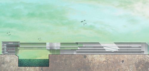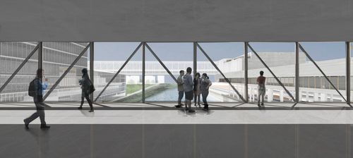 Le «Bâtiment Infrastructure» à l'origine de notre étude relie deux territoires en mutation en franchissant la Seine grâce à deux poutres habitées. La rive côté Villeneuve la Garenne, face au centre commercial Qwartz est inaccessible au niveau du RDC. Ainsi, comme il est impossible de franchir par le niveau du sol, nous proposons de franchir par le niveau R+3. Ainsi, nous recréons la voie piétonne en haut. La Seine est alors franchie par la «Structure habitée», qui devient espace architectural inspirant tout le projet.