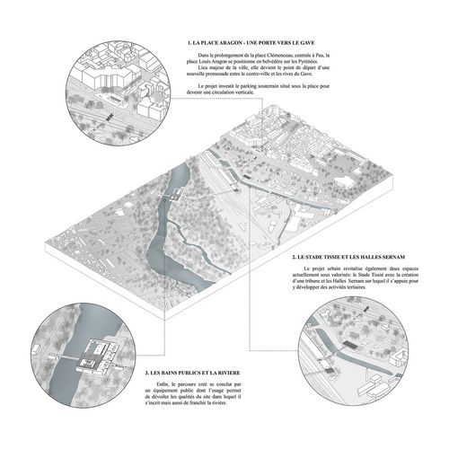 Ce projet prend place dans la ville de Pau, située dans le sud-ouest de la France. Totalement déconnectée de sa rivière (le Gave) et du paysage qui la compose (la saligue), l’objectif consiste à révéler ce territoire au travers d’un projet à la fois urbain et architectural.