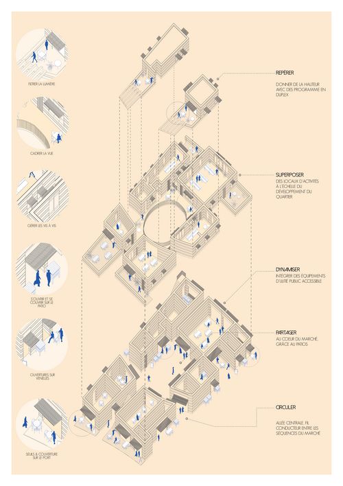 En installant un souk, essence même de la sociabilité et des échanges entre les hommes, on restaure la mémoire de ce lieu qui fît rayonner les agrumes de la Palestine jusque dans les années 40. Associé à des programmes annexes tels que la mise en place de logements pour le sêcheurs résidents actuellement dans le port, une résidence d’artistes en écho à l’activité muséale de la colline de Jaffa, et des bureaux d’activités ; le port pourra retrouver une activité rayonnant vers les quartiers populaires et ponctuer ainsi la promenade le long du littoral.