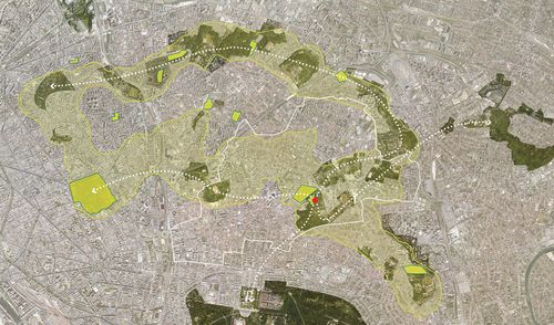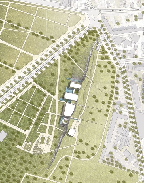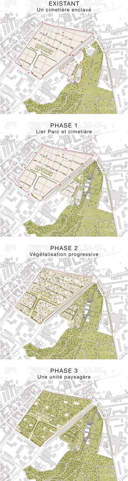 Le projet tend à inscrire la présence des morts dans la ville et à désenclaver un espace public au paysage minéral pour en faire un acteur des liaisons écologiques. En liant parc et cimetière, un dialogue entre les deux mondes s’installe et un nouveau rapport aux espaces funéraires émerge. L’absence est signifiée par la présence des arbres, faisant le lien entre terre et ciel. En revenant à la nature, les morts s’inscrivent dans le cycle de la vie et toujours nous ramènent à l’origine.