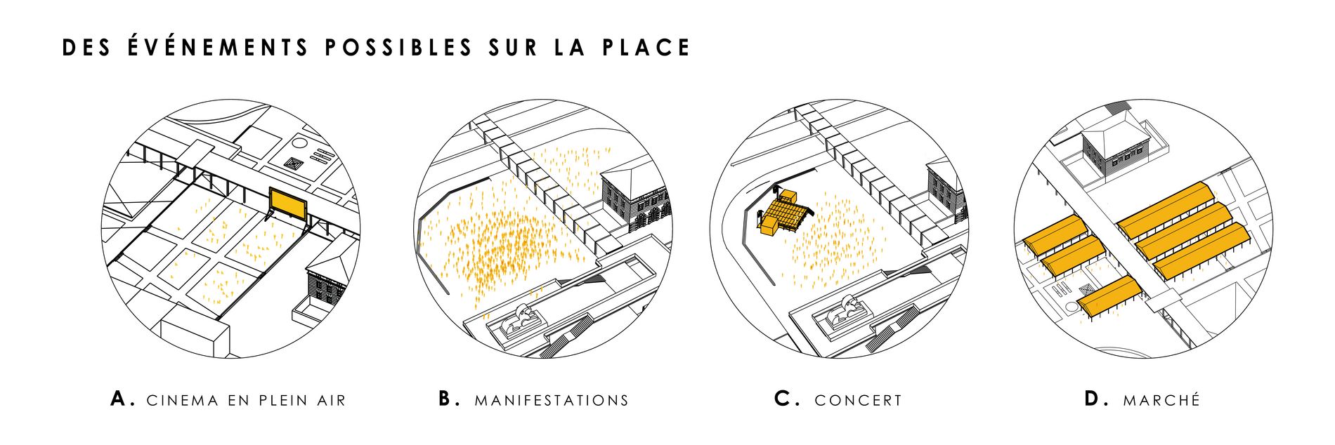 La première intervention sur ce site a été naturellement de redonner la place aux piétons, en effet, elle est actuellement occupée à plus de 50% par les voies de circulation automobiles. Après une étude précise, nous avons distingué trois « zones » sur la place, c’est-à-dire trois espaces dont les aspirations varient. Pour relier ces différentes zones un nouvel axe urbain matérialisé par un système de couverture et de parcours traverse la place d’est en ouest.