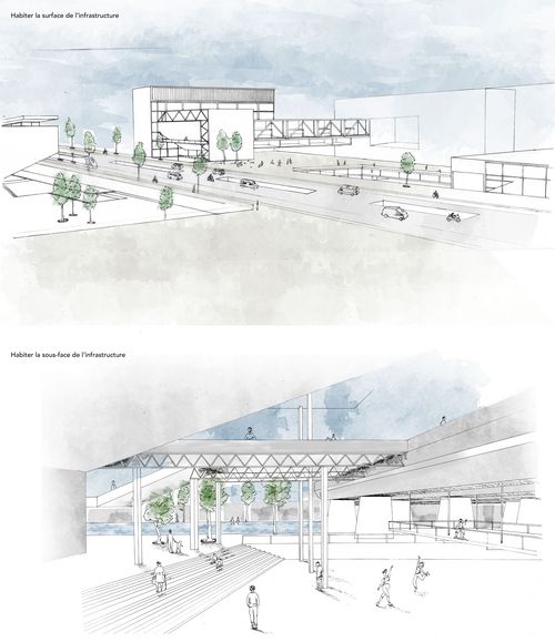 Comment habiter l’infrastructure ? Ce projet propose d’urbaniser les abords de l’A86 le long d’un tronçon allant du Parc des Chanteraines au Stade de France et de créer un nouveau quartier sur L’Île-Saint-Denis. Deux bâtiments seront développés à l’échelle architecturale, une salle de spectacle et une école de scénographie.